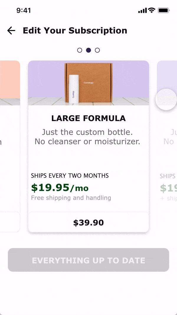 Since Curology currently offers only 3 subscription plans, it made sense to use a horizontal scroll so users could quickly and effectively see their options.